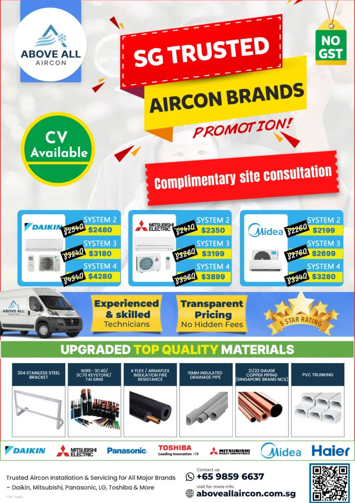 At Above All Aircon, we specialize in aircon installation for HDB flats, condominiums, landed properties, and commercial spaces across Singapore. Our certified technicians ensure every system is installed according to manufacturer guidelines, delivering maximum performance and peace of mind.